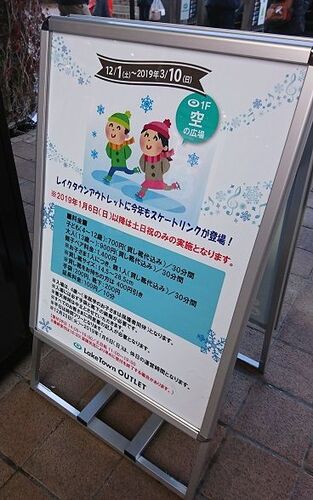 越谷レイクタウンの期間限定イベント「わくわくスケートひろば」へ。4歳から利用可能で、30分滑れるので買い物ついでにふらっと寄れます。パネルリンクという樹脂製リンクで、初心者や子供向きです。