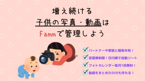 「Famm」は、容量無制限で我が子の写真や動画を家族と共有できるアプリです。フォトアルバムとしての機能だけでなく、自動で作られるコラージュ、1冊無料で届くフォトカレンダーや3ヶ月毎に届くDVDなど、関連サービスも豊富です。