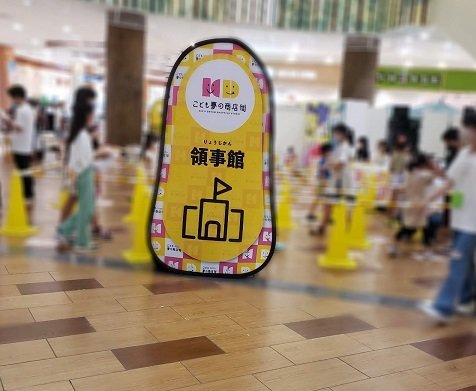 ここからは子供本人だけで領事館へ。ひと通り説明を聞き、発行したビザと会場案内図とおむすび通貨*2をもらってきます。
